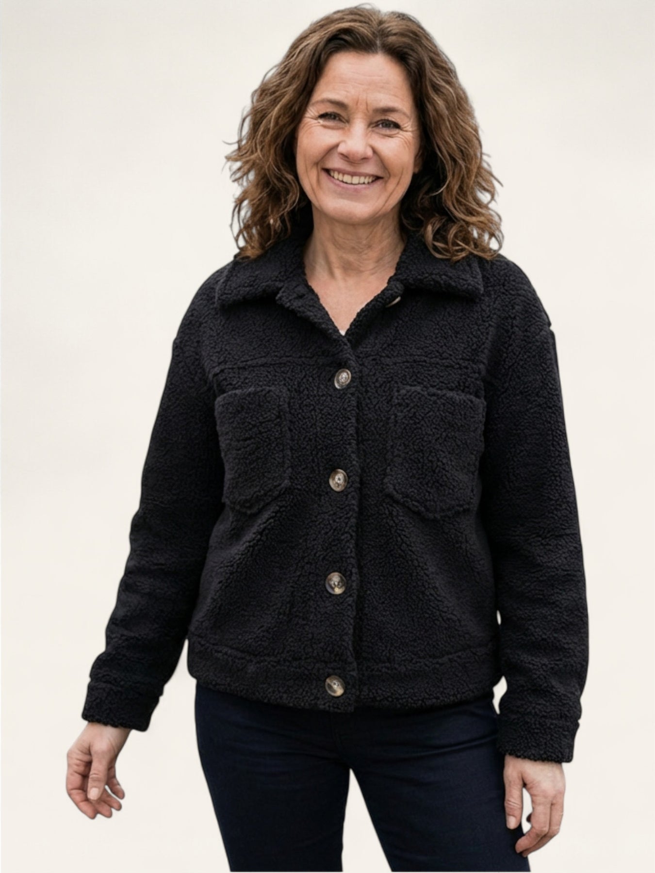 Denne jakken gir varme og uformell stil til hverdagsgarderoben din. Det korte, kasseformede snittet og den klassiske reverskragen kombinerer struktur og mykhet. Den enkle knappelukkingen og de påsydde lommene gir en subtil detalj, mens jakkens tekstur gir den en behagelig, varm følelse. Den er perfekt for byvandringer, uformelle utflukter eller rolige kvelder hjemme.