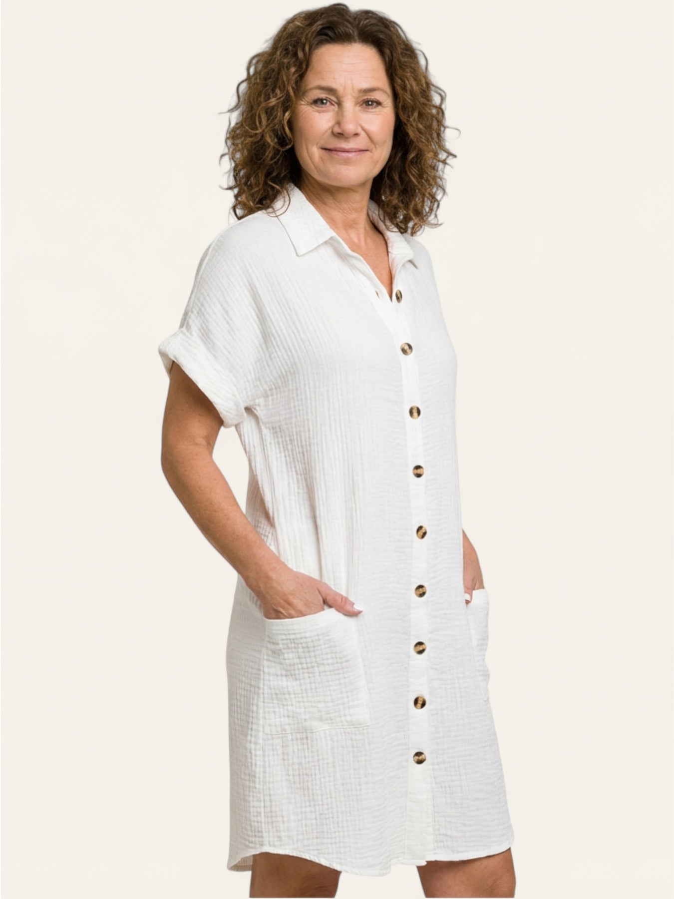 Din luftige kjole for hver dag, laget for kvinner som ønsker både eleganse og uformell komfort. Med en flatterende silhuett og en fjærlett følelse holder Elly deg kjølig, velkledd og fri til å bevege deg fra brunsj til solnedgang – uten å gå på akkord med sjarm eller komfort.