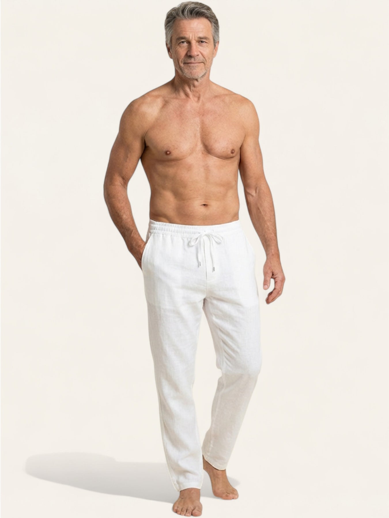 Den Linnen Santorini Solbukse er laget for menn som verdsetter komfort, pusteevne og en uanstrengt stil. Denne buksa er laget av førsteklasses lin og har en avslappet passform som holder deg sval og stilig - perfekt for stranddager, ferier eller uformelle sommerutflukter.